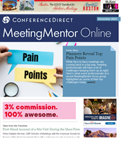 ConferenceDirect MeetingMentor spotlights best practices and new ideas to help 14,000-plus meeting professionals at corporations and associations improve their conferences, exhibitions and events. The quarterly magazine and its digital edition go to the proprietary database of ConferenceDirect, whose 350+ associates book 3,734,072 million room nights, 11,558 meetings/events and $781 million in group revenue annually. MeetingMentor Online is a “news you can use” monthly enewsletter that blasts to more than 30,000 meeting professionals.